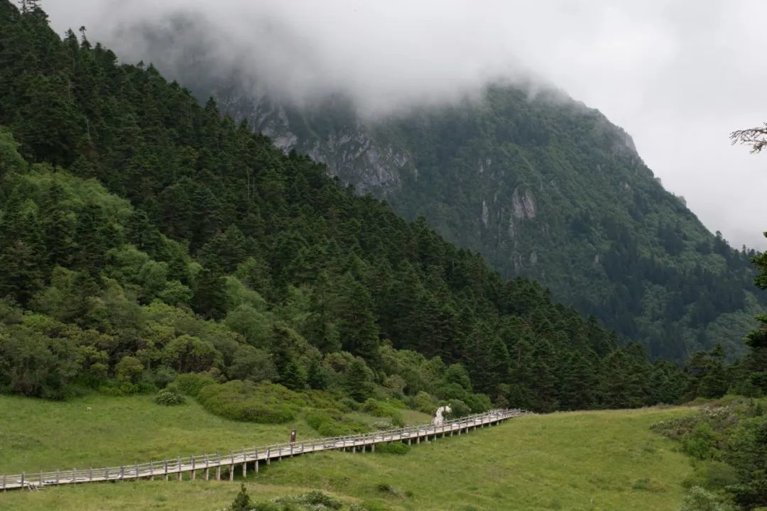 这个季节的官鹅沟水量丰沛,多处瀑布进入最佳观赏期。官鹅天瀑气势磅礴,虎口瀑晶莹剔透,九叠瀑如白练垂空。雨后初晴时,常有彩虹横跨峡谷,美不胜收。高山湖泊在烈日阳光下呈现深浅不一的碧绿色彩,鹅嫚湖、泽荡措等湖泊清澈见底,倒映着四周的苍翠山峦。
