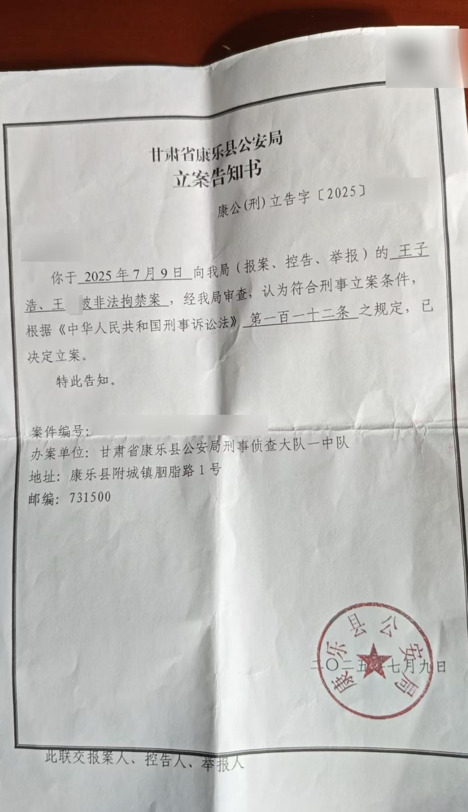 之后,王先生到老家康乐县警方报案,7月9日,康乐县公安局刑事侦查大队一中队向家属出具了立案告知书。