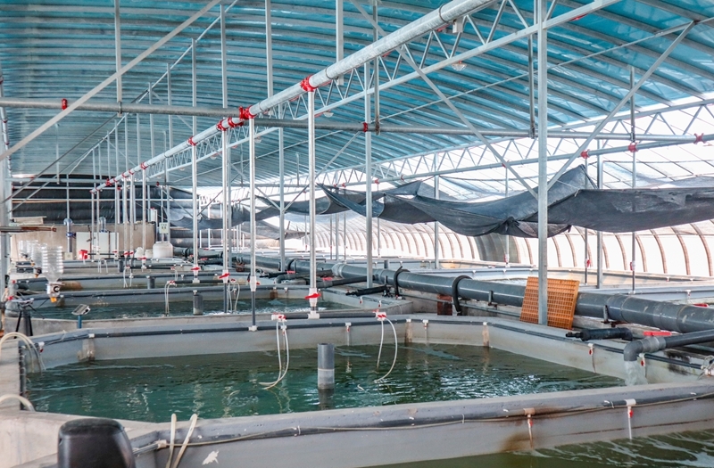 经过3年时间发展,该合作社依托自主创新研发的循环水养殖系统,通过加盐、矿物质、微量元素等方式,不仅调配出“人工海水”,且养虾用水经过生物降解、物理过滤,可回流重复使用,相比传统土塘养虾,相同产量可节水95%左右。同时,搭配加热设备和钢架保温大棚双层棚膜,合理控制棚温,养殖活虾实现全年无间断上市。