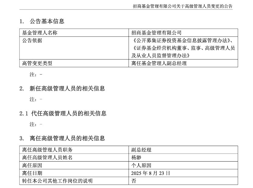 其他高管变动方面,招商基金发布高级管理人员变更公告。公告显示,副总经理杨渺因个人原因离任。