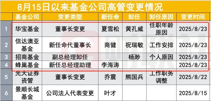 8月22日晚间以来,华宝基金公告董事长换帅,夏雪松接任黄孔威出任董事长;信达澳亚任命商健代为履行董事长职务,原董事长祝瑞敏离任;招商基金副总,也是专户基金经理杨渺离任;蜂巢基金新任李海涛为总经理助理。