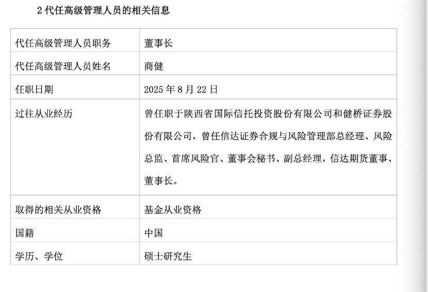信达澳亚基金公告称,任命商健代为履行董事长职务,原董事长祝瑞敏卸任。