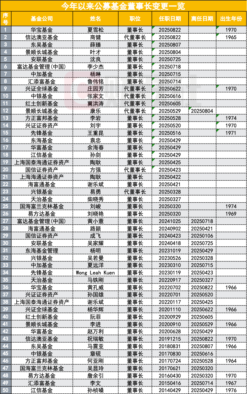 年内20家基金公司董事长变动50次