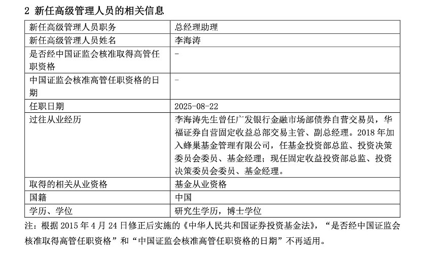 中小基金公司依然是投而优则仕。蜂巢基金新任命了李海涛为总经理助理,履历显示,李海涛曾任广发银行金融市场部债券自营交易员,华福证券自营固定收益总部交易主管、副总经理。2018年加入蜂巢基金管理有限公司,任基金投资部总监、投资决策委员会委员、基金经理;现任固定收益投资部总监、投资决策委员会委员、基金经理。