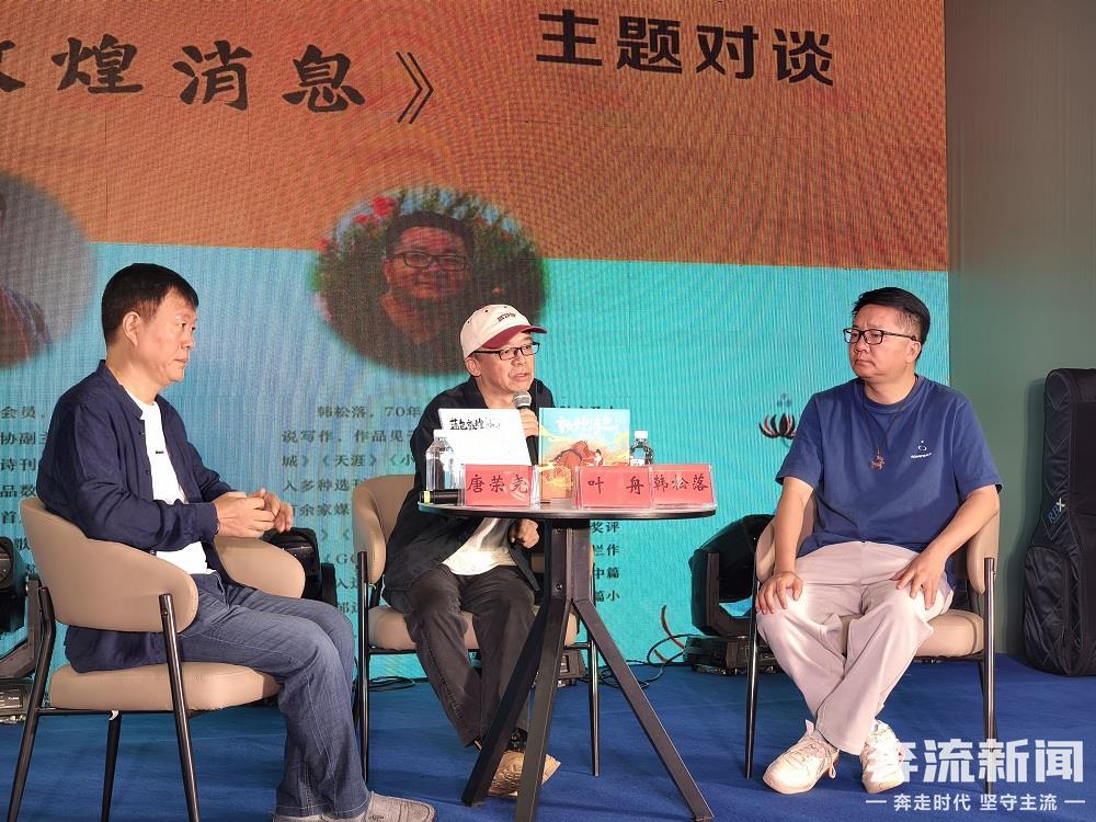 奔流新闻讯(首席记者 郑重)8月20日下午,著名作家、诗人叶舟携其新近出版的两部绘本作品《蓝色敦煌》和《敦煌消息》,与作家唐荣尧、韩松落作客2025兰州书展,展开了一场关于敦煌文化的思想对话。