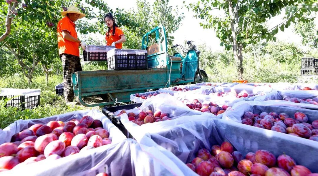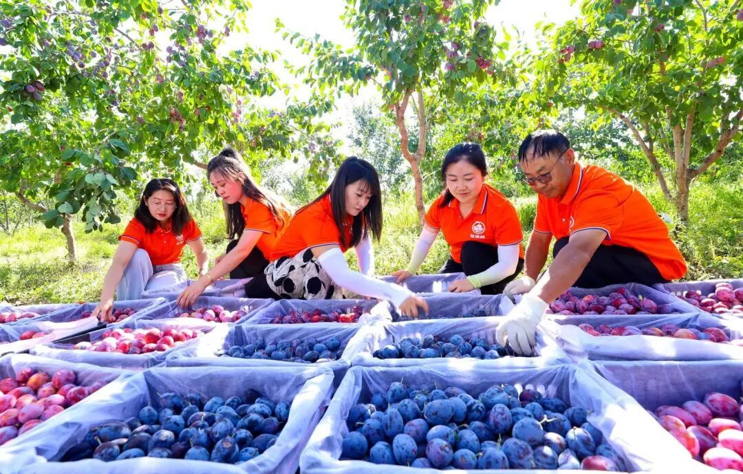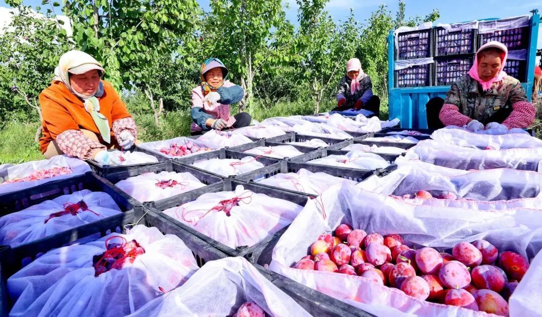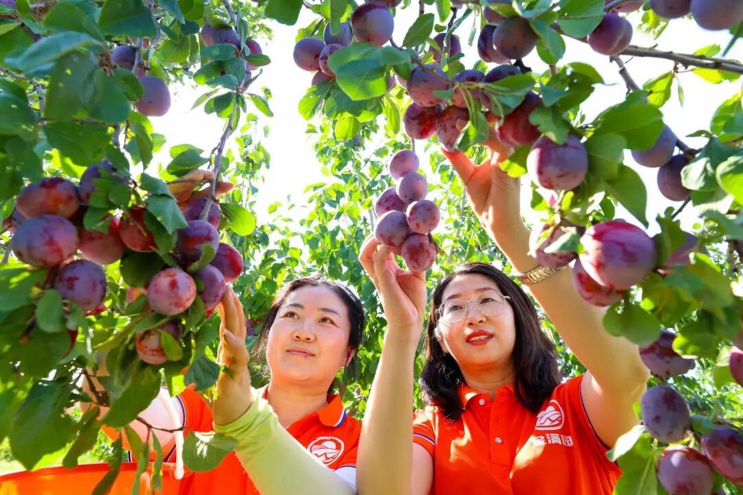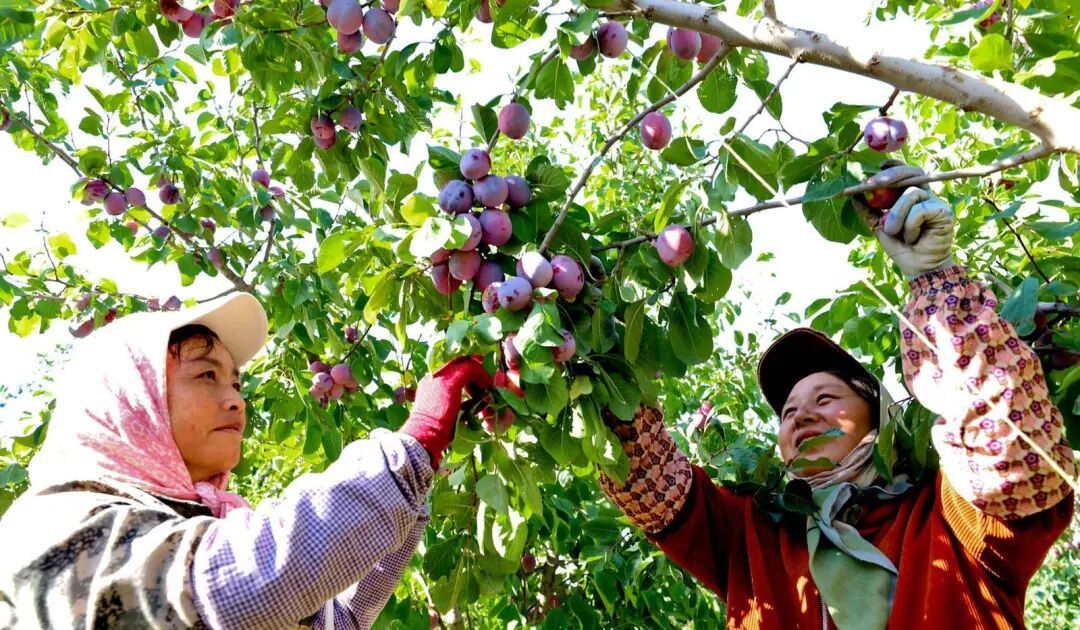 工作人员在甘州区石岗墩滩金满园农牧农民专业合作社特色林果种植基地采摘有机西梅