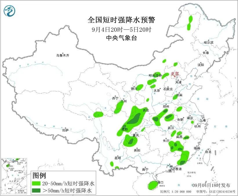 预计,9月4日20时至5日20时,四川北部、陕西南部、甘肃南部等地部分地区发生山洪灾害可能性较大(黄色预警),其中,陕西西南部局地发生山洪灾害可能性大(橙色预警)。其他地区也可能因局地短历时强降水引发山洪灾害,请各地注意做好实时监测、防汛预警和转移避险等防范工作。