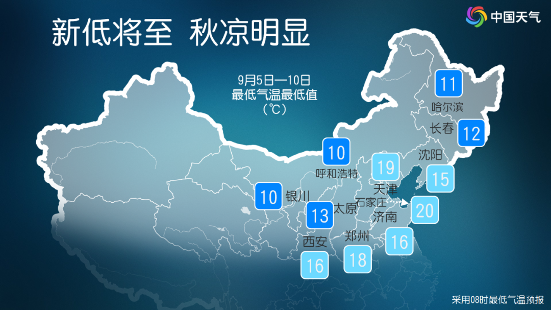 这股冷空气过后,北方的最低气温也会明显下降。预计6日至10日,北方多地的最低气温将刷新立秋后新低,西北东部、华北北部、东北过程最低气温只有10℃出头。对于气象意义上大部地区还没入秋的华北地区来说,6日以后也会有一种换季的感觉。