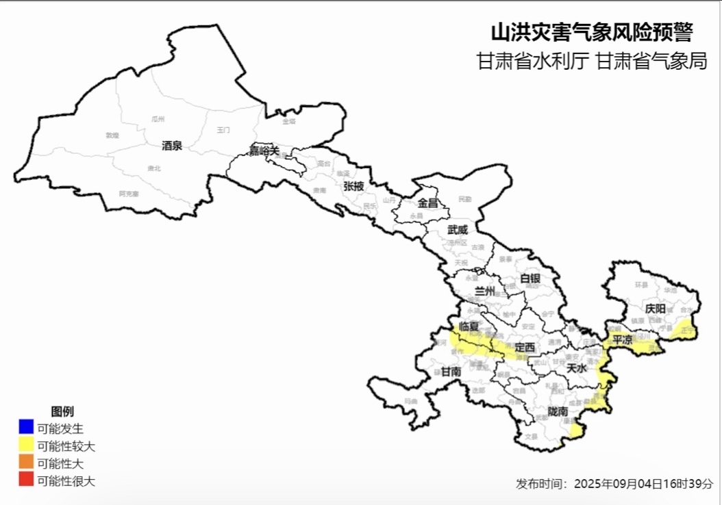 预计,9月4日17时至9月5日14时,天水市(麦积区、清水县、张家川县),平凉市(崆峒区、泾川县、灵台县、崇信县、华亭市),庆阳市(正宁县、宁县),陇南市(康县、徽县、两当县),定西市(渭源县、临洮县、漳县),临夏州(临夏县、康乐县、广河县、和政县),甘南州(合作市、临潭县、卓尼县、夏河县)等地区发生山洪灾害可能性较大(黄色预警);其他地区也可能因局地短历时强降水引发山洪灾害,请相关部门注意做好实时监测、防汛预警和危险区人员转移避险等防范工作,社会公众注意防灾避险。