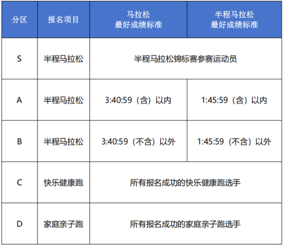 组委会依据选手在2023年1月1日至2025年8月24日期间,参加的中国田径协会可查询的马拉松项目或半程马拉松项目的最好成绩作为分区依据。详细分区安排如下:
