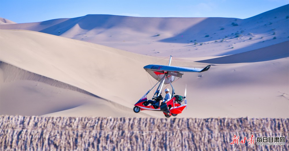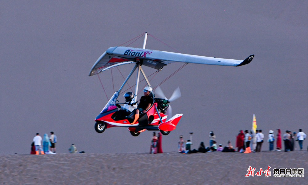 秋日,走进鸣沙山月牙泉景区,除了“山泉共处,沙水共生”的经典景致,低空飞行项目更是吸引了游客目光。直升机轰鸣升空,游客在百米高空俯瞰,月牙泉如一块碧绿翡翠镶嵌在金色沙海,与连绵的鸣沙山构成绝美画卷,大漠奇景的壮阔在脚下一览无余;动力滑翔机则似灵动飞鸟,贴着沙丘低空滑翔,让游客在惊险与刺激中,近距离感受大漠雄浑的独特魅力。