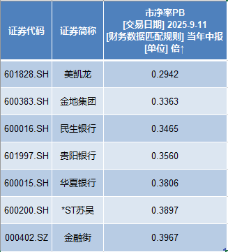 其中,美凯龙(601828)破净率最高,市净率仅为0.29。金地集团(600383)、民生银行(600016)紧随其后,市净率分别为0.34%和0.35%。