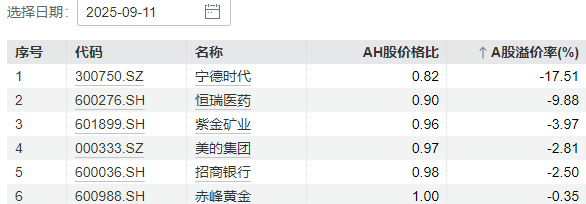 再次,截至9月11日,还有6只股票的AH股价存在倒挂,AH股价格比小于或等于1,A股溢价率为负。