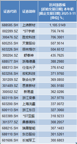 *ST宇顺(002289)、胜宏科技(300476)年初至今涨幅均超过700%,分别达到756.74%、706.30%。