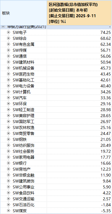 机械设备、医药生物、基础化工、电力设备等板块,年初至今涨幅超过40%,分别达到45.73%、43.45%、42.61%、40.40%。