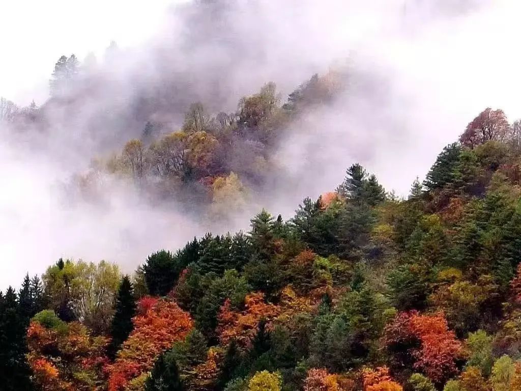 山是个慢热的画家,正一笔笔给绿意添新色。先是沟边的野杏树,叶尖悄悄蘸了点橙,像不小心蹭到了晚霞;接着是坡上的五角枫,把半面叶子染成绯红,风过时便摇出一串细碎的胭脂;最执着的是松涛,依旧捧着浓绿的墨,却在树缝里漏下些金黄的野菊,成了画里最灵动的落款。远远望去,山峦像被晕开的水彩,浓淡相宜间藏着说不尽的温柔,走一步换一种色调,让人忍不住想跟着山路往前探,看下一笔会落在何处。