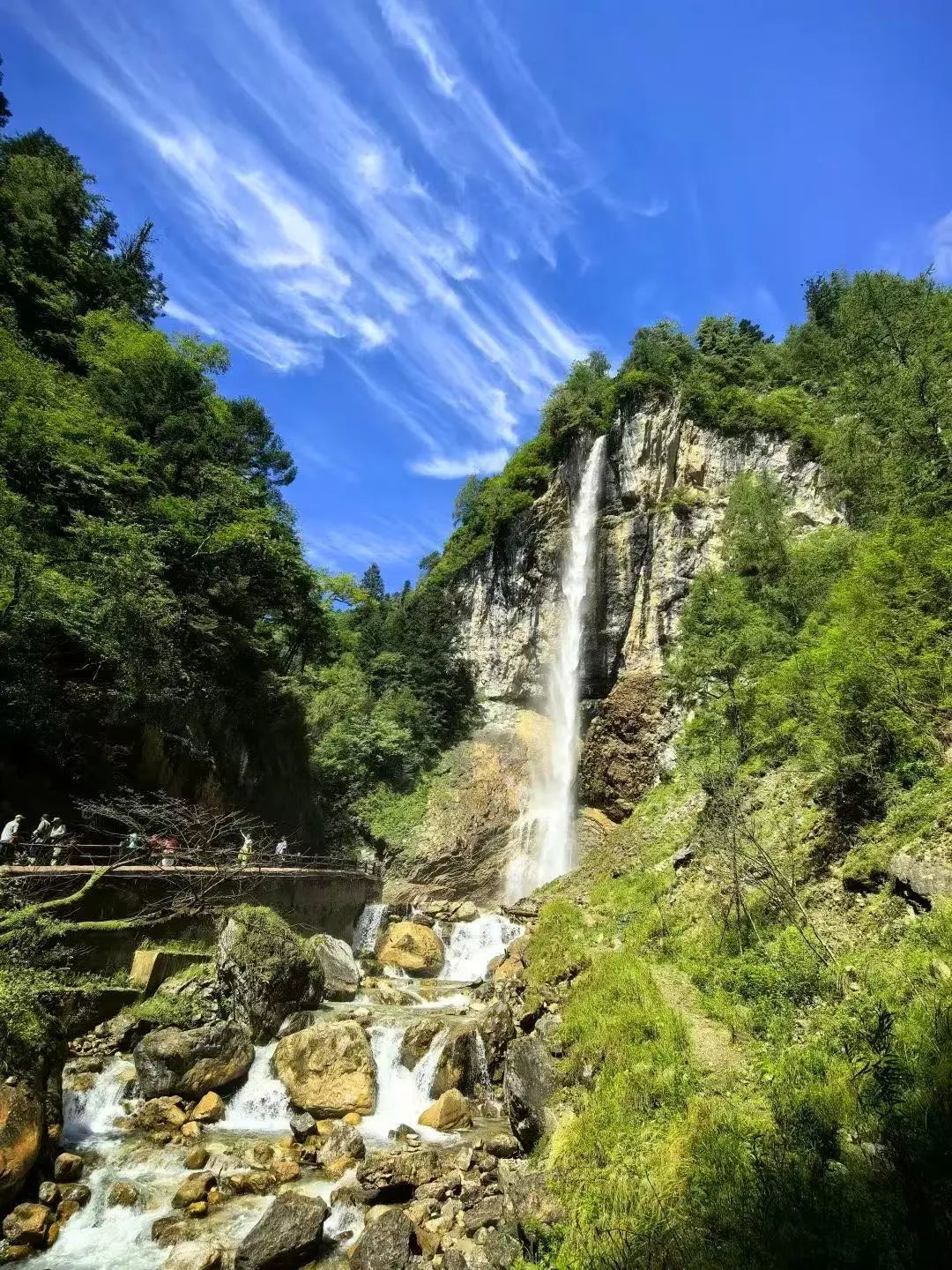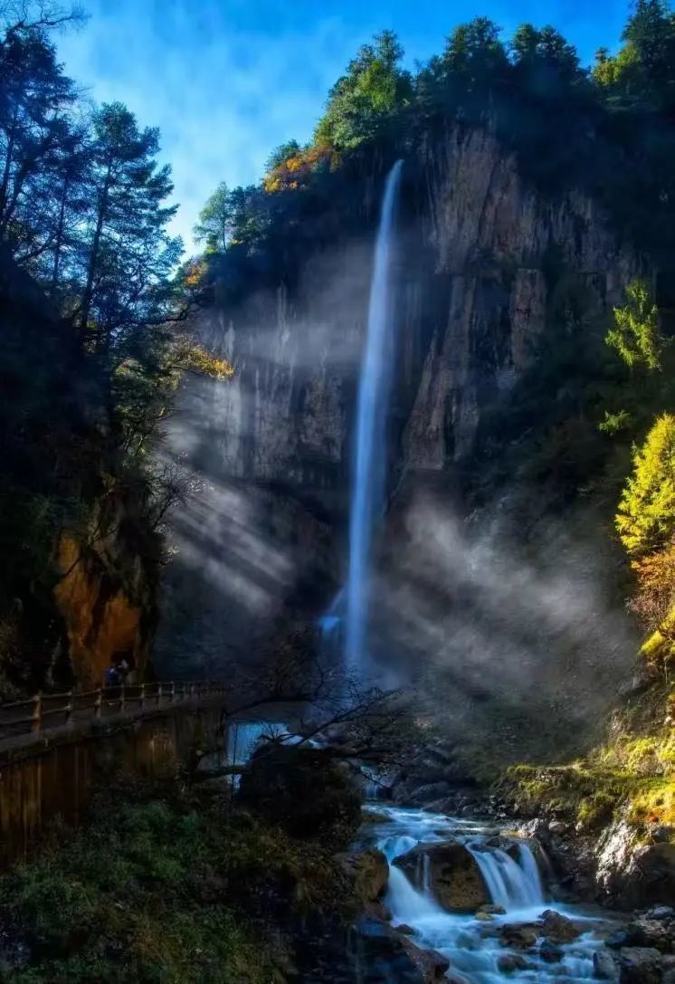 栈道旁的草木也藏着秋的絮语。蒲公英撑着白绒伞,在风里轻轻晃,像在说“快来呀,跟着我去看更深的秋”;石缝里的青苔透着水润,踩上去软乎乎的,沾着晨露的凉,混着草木的香,吸一口,连肺腑都被洗得透亮。若遇着晨雾就更妙了。轻纱似的雾漫过山腰,把渐染的山色晕成了水墨画,远处的瀑布成了留白,只听见水声叮咚,像画家落笔的轻响。