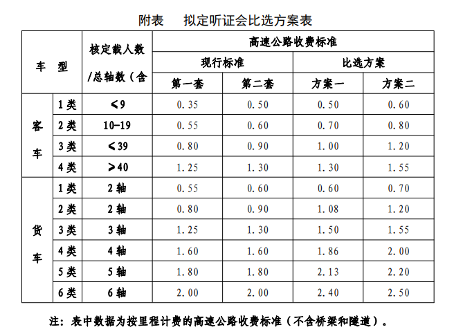 根据《方案》,将对2009年以来通车运营的38条高速公路收费标准进行优化完善,对现行第一套(0.35)和第二套(0.50)收费基价进行合并统一,其他类型车辆收费标准适当调整,桥梁和隧道加收标准统一调整为500米以上桥梁和隧道按照实际里程的1.5倍计费(加收部分为实际里程的0.5倍),10公里以上桥梁和隧道按照实际里程的3倍计费。按照“一次听证,分步落地”的原则,对客车收费标准一次性调整到位,货车收费标准分四步调整到位(每次调整目标值增幅的25%)。