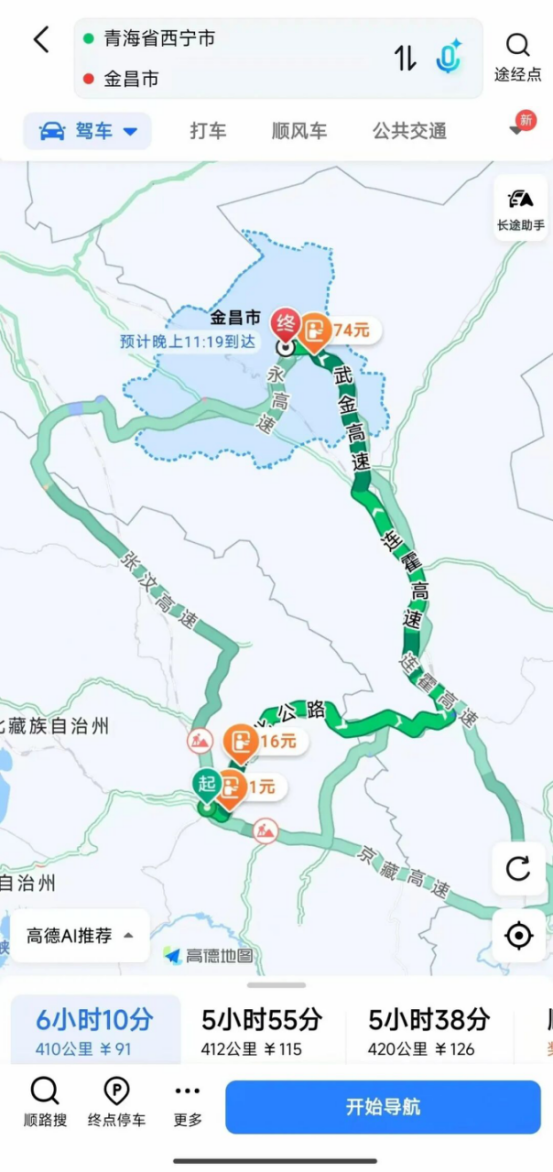 路线:嘉峪关→连霍高速→阿永高速→金昌