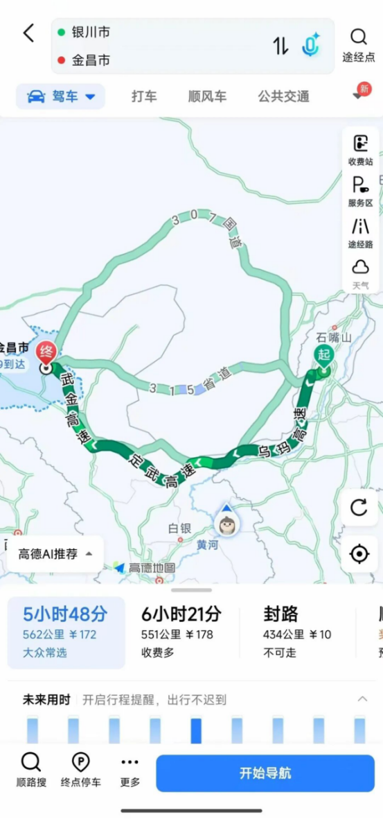 路线:银川→银川绕城高速→乌玛高速→定武高速→连霍高速→武金高速→金昌