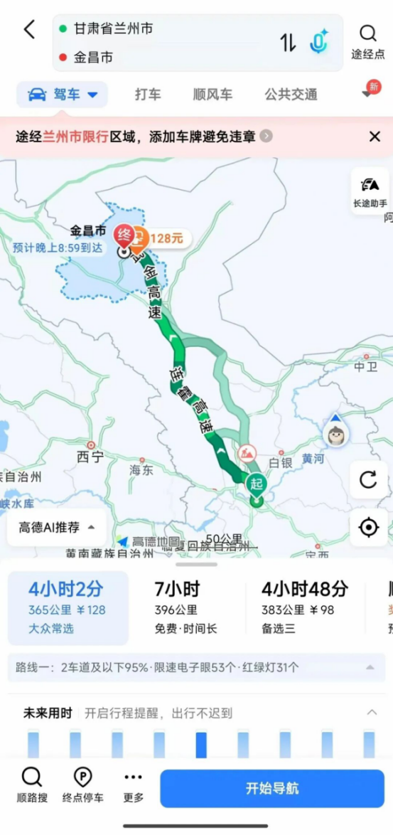 路线:兰州→连霍高速→京藏高速→连霍高速→武金高速→金昌