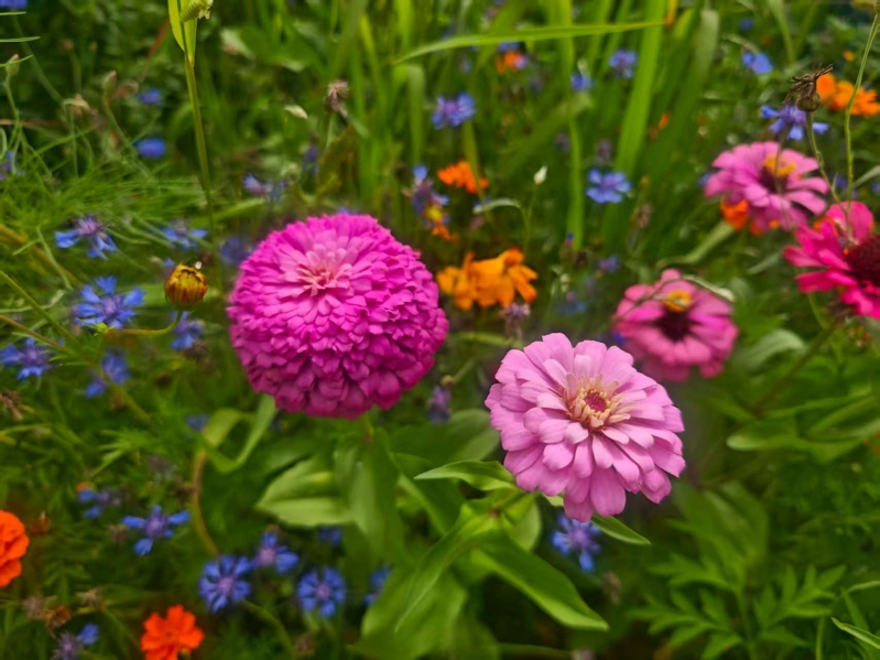 一进大南峪,大片缤纷的花海就扑面而来!百日菊开得正旺,红的、粉的、黄的……五颜六色汇成一片绚丽海洋。阳光洒下来,花朵随风轻摇,香气扑鼻,游客们纷纷走进花田,拍照的、闻花的、发朋友圈的,个个玩得不亦乐乎。“一直听说大南峪风景美,这次趁国庆来一看,果然名不虚传!随手一拍都特别出片!”一位游客开心地说。