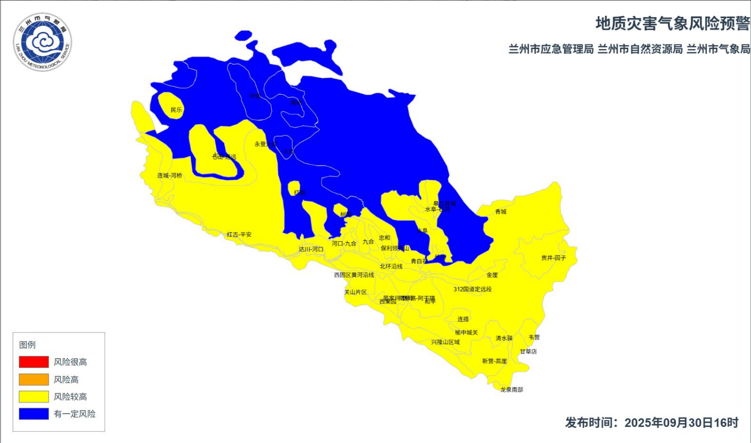 新甘肃客户端兰州9月30日讯(新甘肃·甘肃日报记者 王思璇)记者从兰州市气象局获悉,今天下午,兰州市发布地质灾害气象风险黄色预警。