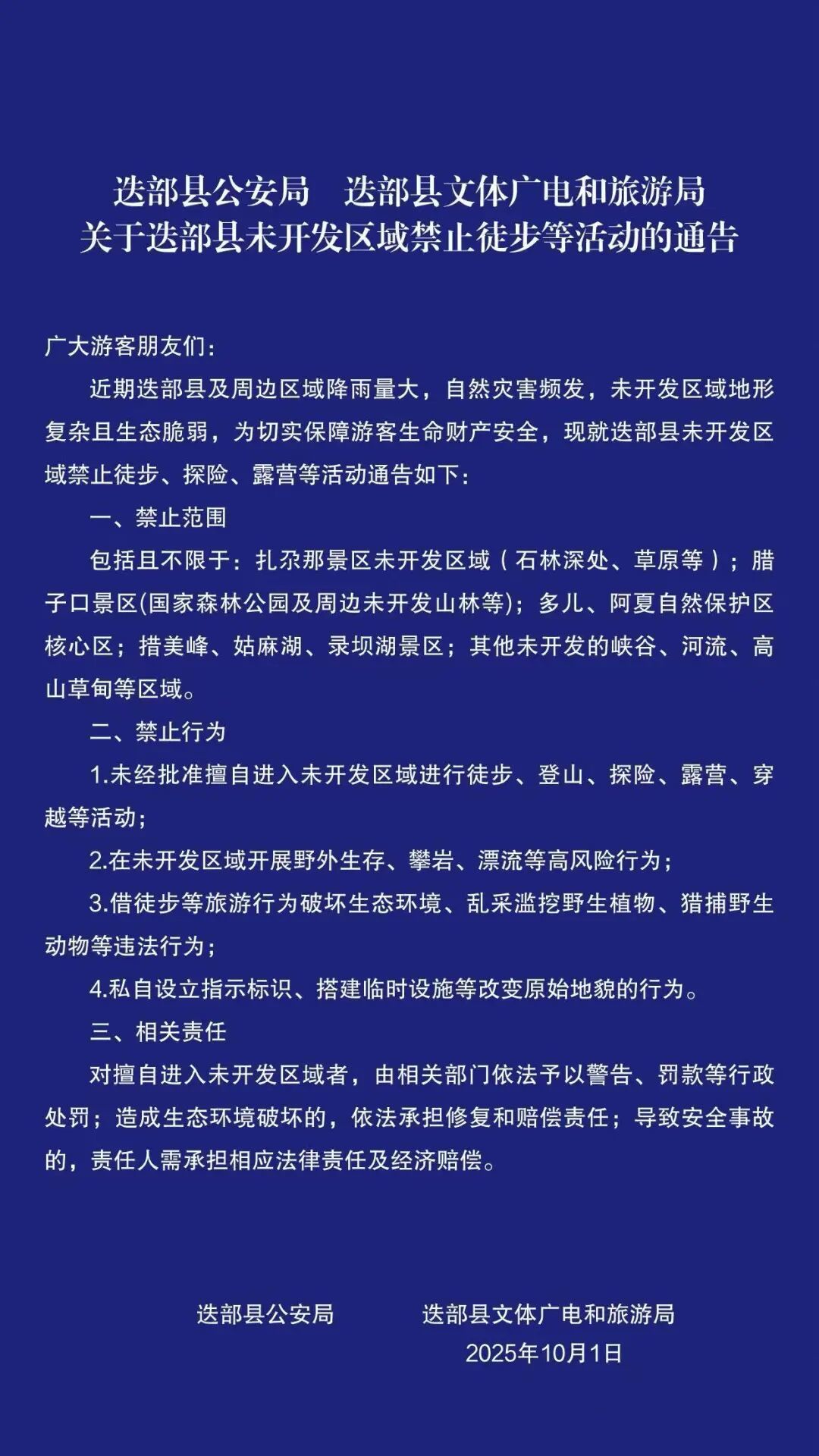 公告明确指出,违反公告擅自进入景区的,有关部门将依法采取劝返、告诫、行政处罚等措施。因违规进入导致被困需救援的,产生的搜救、医疗、交通等费用由当事人全额承担。