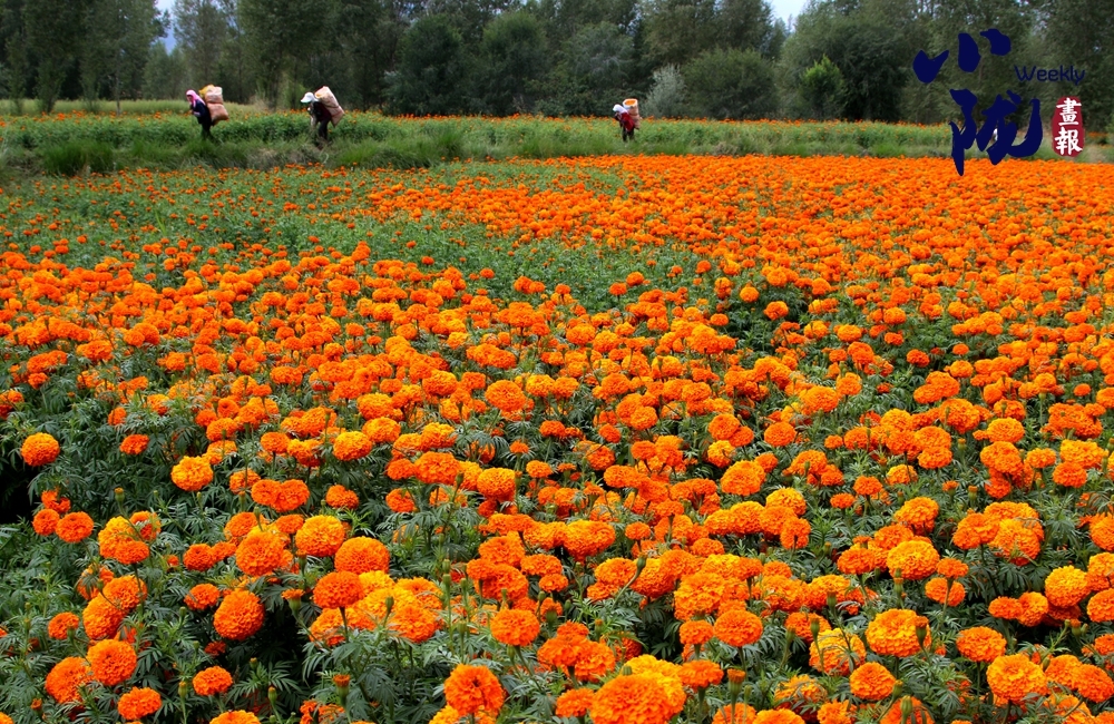 金黄的万寿菊低垂着头,仿佛是在向大地母亲致谢,感谢她给予的滋养与庇护。农人们穿梭其间,脸上洋溢着满足与幸福的笑容,他们的汗水在这一刻得到了丰厚的回报。