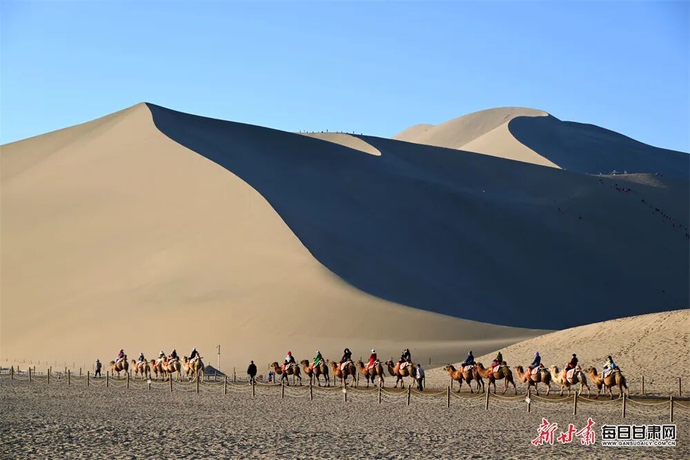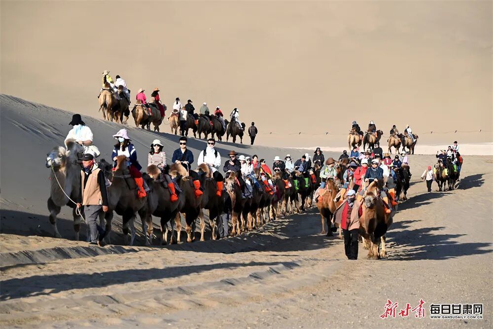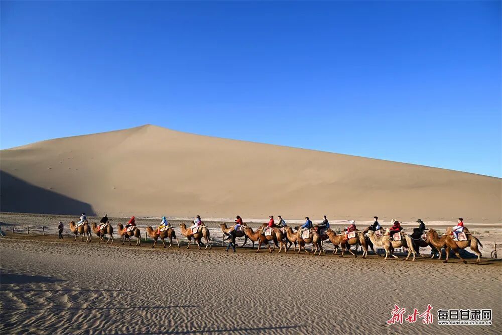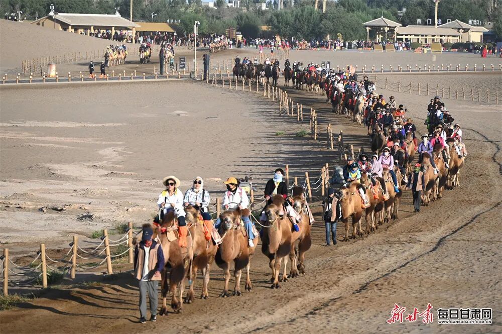 金秋时节的敦煌,鸣沙山的沙丘被秋阳镀上暖金,月牙泉畔草木添了几分清润,大漠与绿洲交织的独特景致尽显丝路风情,骑上骆驼,感悟当年的丝路繁华。