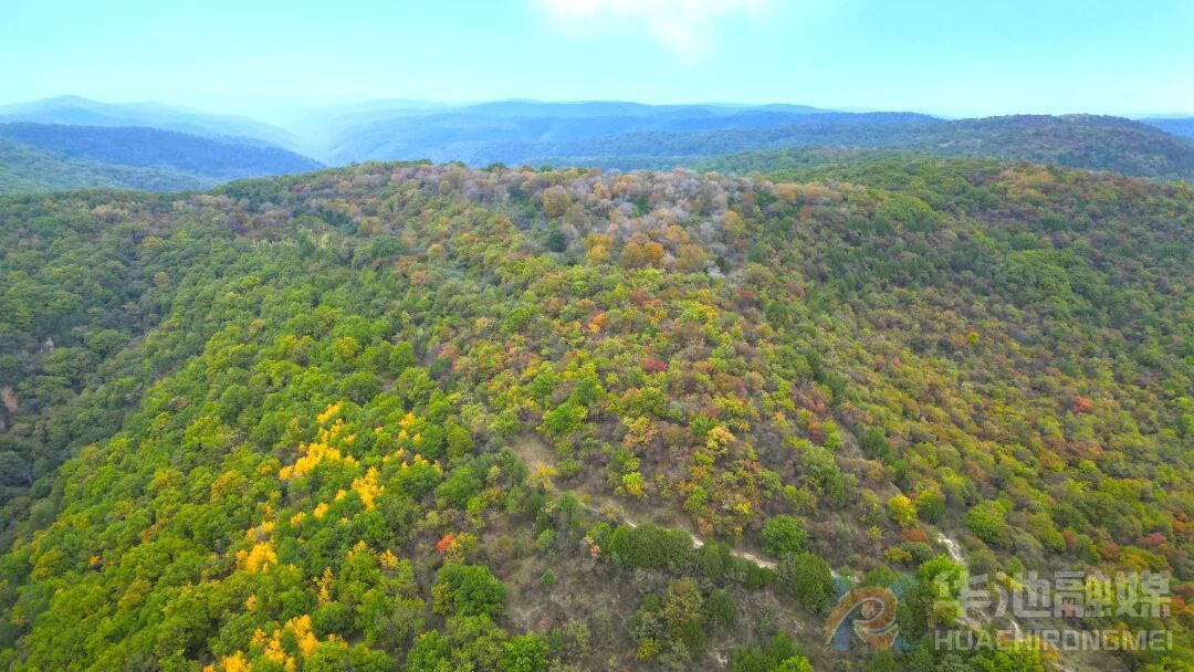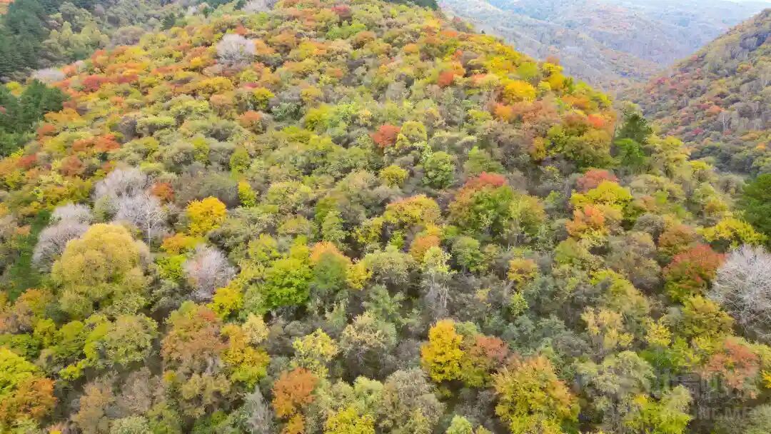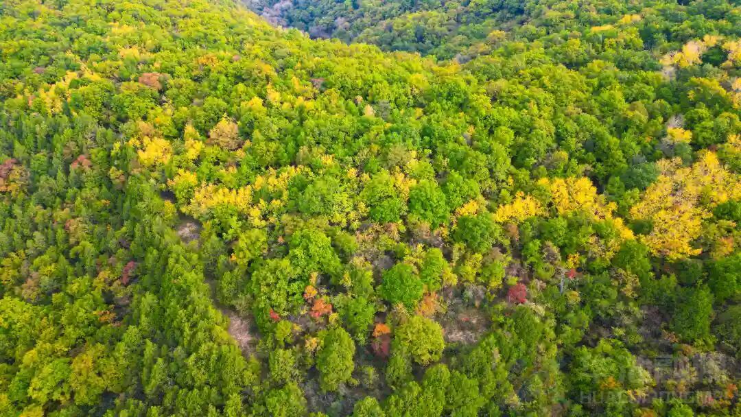 无论站在什么方位,无论从哪个角度,放眼望去,漫山遍野层林尽染,葱绿的松叶、亮黄的杏叶、猩红的枫叶、紫红的栌叶、鹅黄的海棠、橙红的漆树、斑驳的杜梨……金黄、殷红、墨绿浑然天成,相映生辉。