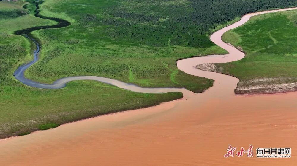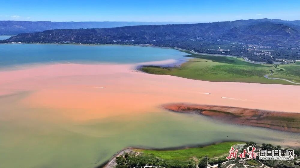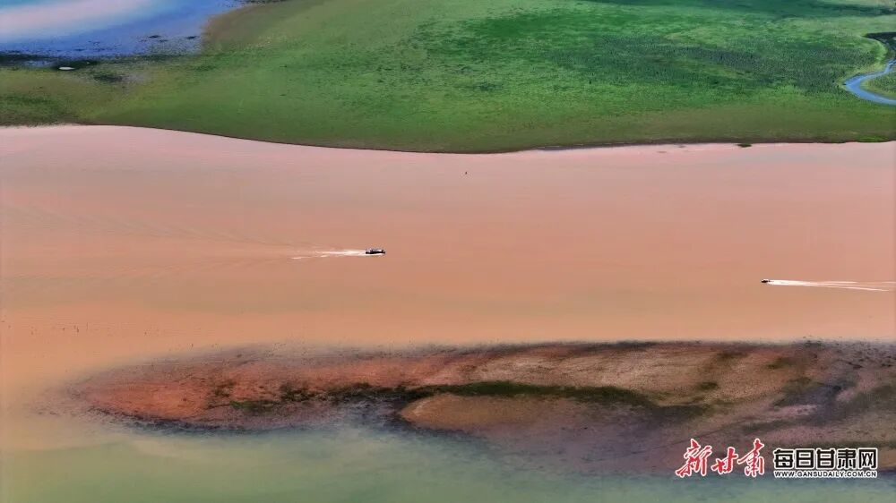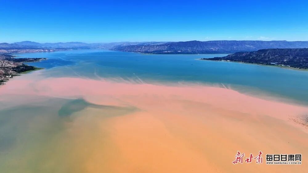 临夏州刘家峡水库位于黄河上游,这里有一处神奇的景观——黄洮交汇。一清一浊一绿一黄,黄河和它的第二大支流洮河交汇形成了清晰的分界线,碧蓝的黄河与橙黄的洮河相遇,以“Y”字形在龙汇山前交汇,泾渭分明形成天然“鸳鸯锅”。