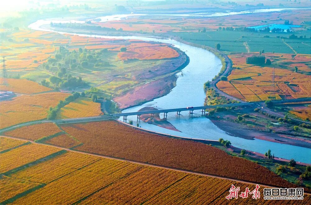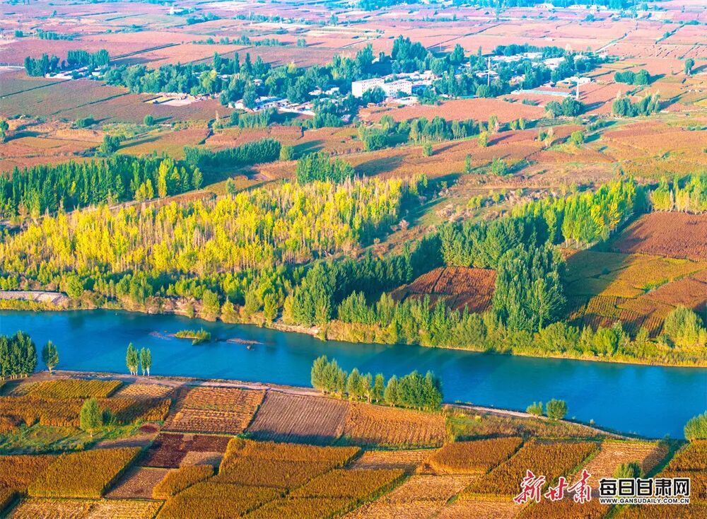金秋的张掖市甘州区乌江镇黑河流域,碧水蜿蜒,田园金黄,与错落有致的村庄、林带、道路桥梁构成了一幅美丽的金秋“丰”景画卷。
