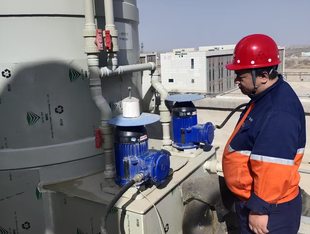 在专精特新化工产业孵化基地公辅设备旁,公辅人员们穿着厚重的劳保服,戴着安全帽和防护口罩,冒着秋雨,穿梭在林立的设备之间。他们的脚步坚定而有力,每一个阀门、每一根管线都要仔细检查。