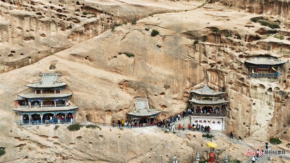 10月4日,张掖市肃南县马蹄石窟群旅游景区迎来客流高峰,秋日的五彩斑斓与千年石窟的历史厚重交相辉映,为游客带来了一场自然之美与文化之韵交融的沉浸式体验。新甘肃·每日甘肃网通讯员 王生林 摄影报道