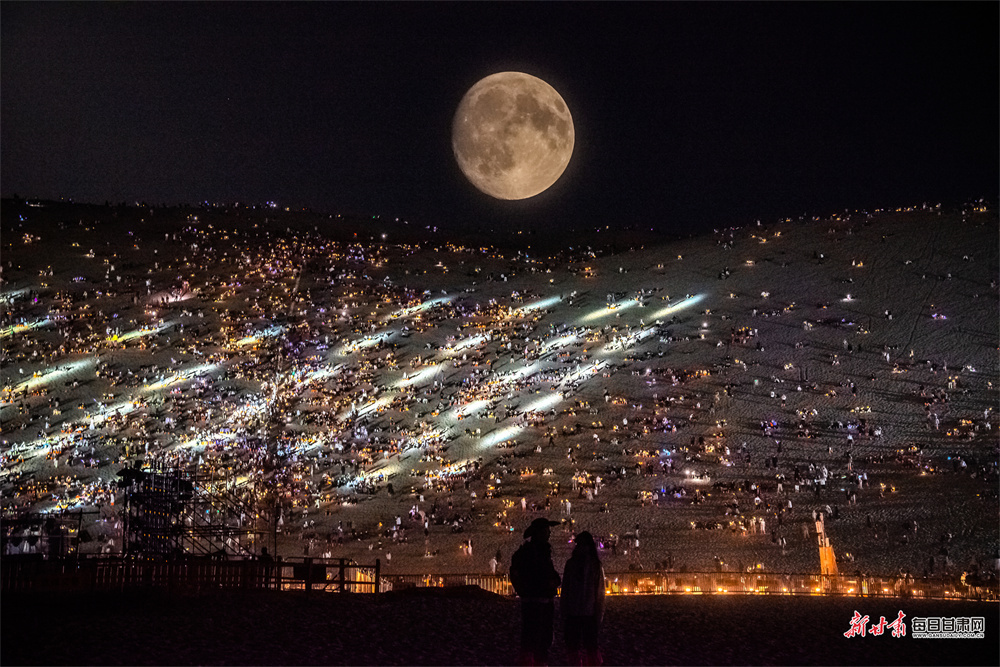 10月5日晚,敦煌鸣沙山月牙泉景区,数万名游客在浩瀚星空下共赏明月,万人合唱共迎佳节。新甘肃·每日甘肃网通讯员 王斌银 周玉玲 摄影报道