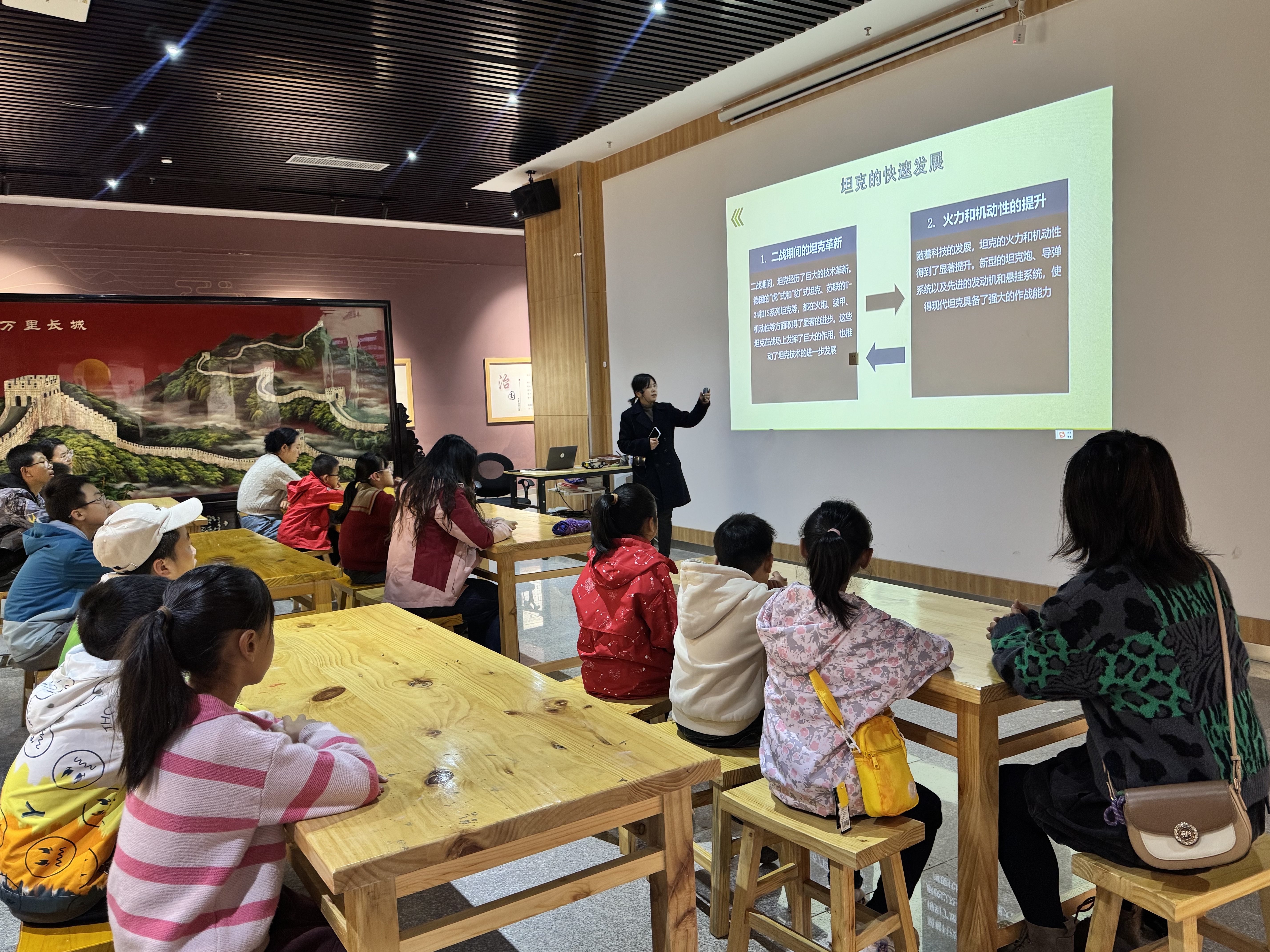 “坦克为什么被称为‘陆战之王’?从初代坦克到现代主战坦克,性能发生了哪些飞跃?”活动伊始,“陆战之王与现代国防”主题PPT讲堂率先开讲。屏幕上,黑白史料与现代坦克美图交替闪现,讲解员用生动的案例拆解坦克的装甲、火炮、动力等核心结构,原本抽象的国防知识变得鲜活易懂。孩子们听得聚精会神,时不时举手追问“坦克的履带断了怎么办”“电机是怎么让履带转起来的”,现场互动不断。