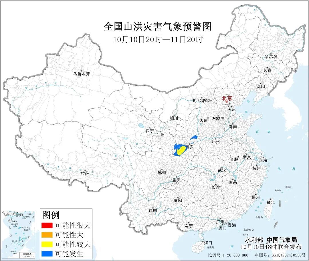 水利部和中国气象局10月10日18时联合发布黄色山洪灾害气象预警:预计,10月10日20时至11日20时,四川东北部、陕西西南部和中部、甘肃东南部等地部分地区可能发生山洪灾害(蓝色预警),其中,陕西西南部局地发生山洪灾害可能性较大(黄色预警)其他地区也可能因局地短历时强降水引发山洪灾害,请各地注意做好实时监测、防汛预警和转移避险等防范工作。