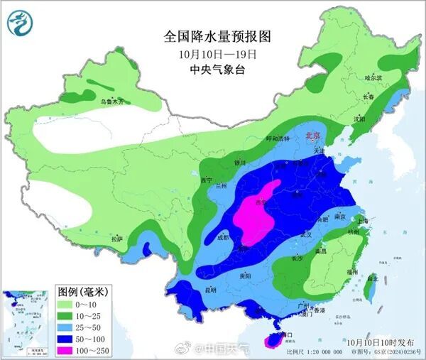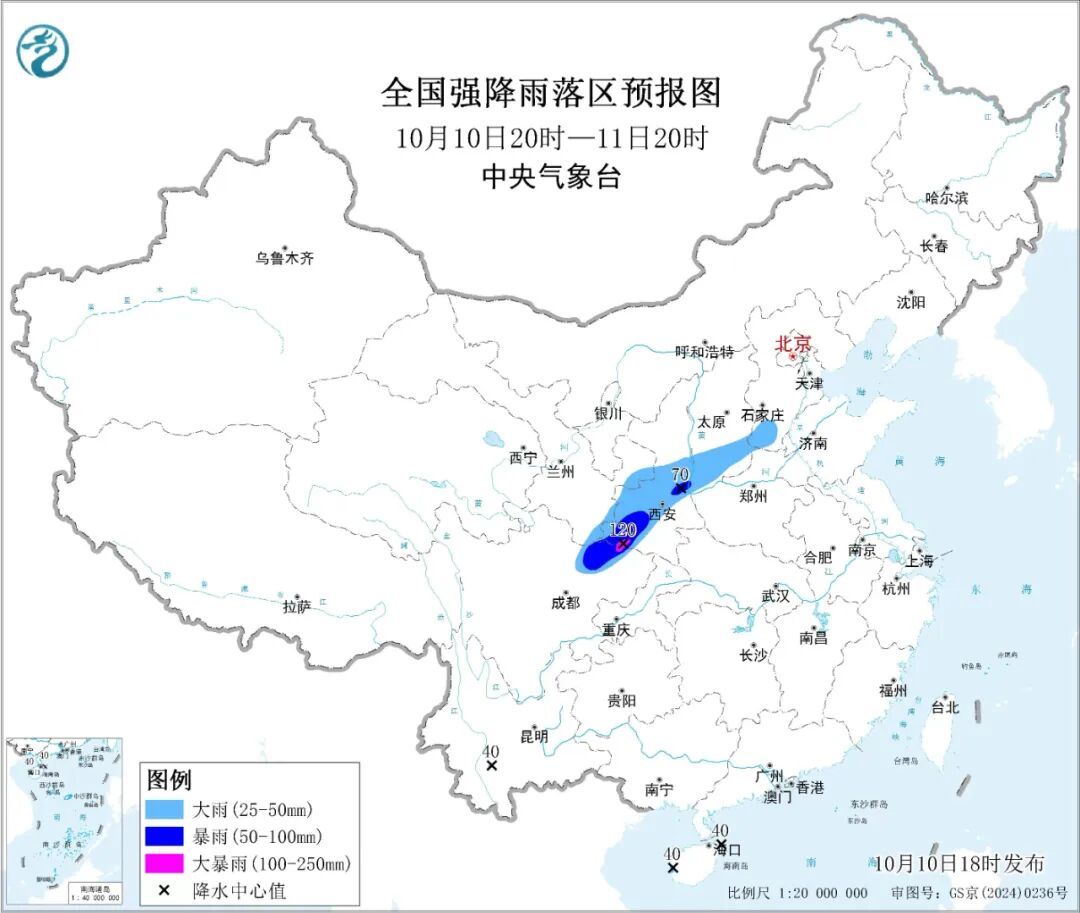中央气象台10月10日18时继续发布暴雨蓝色预警:预计,10月10日20时至11日20时,四川盆地西北部、甘肃东部和南部、陕西中部和南部、山西南部、河北南部等地的部分地区有大到暴雨,其中,陕西南部、四川盆地西北部等地局地有大暴雨(100~120毫米)。上述部分地区伴有短时强降水(最大小时降雨量20~30毫米,局地可超过40毫米),局地有雷暴大风等强对流天气。