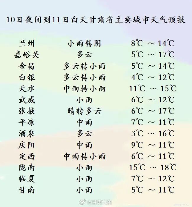 明天夜间到后天白天(10月11日20时-10月12日20时),平凉、庆阳两市及天水市东部、陇南市东部阴有中雨,局部地方有大雨;河西五市多云或晴,其中祁连山区阴有小雨(雪)或雨夹雪;省内其余地方阴有小到中雨(雪)。另外,陇中、陇东部分地方有雾。