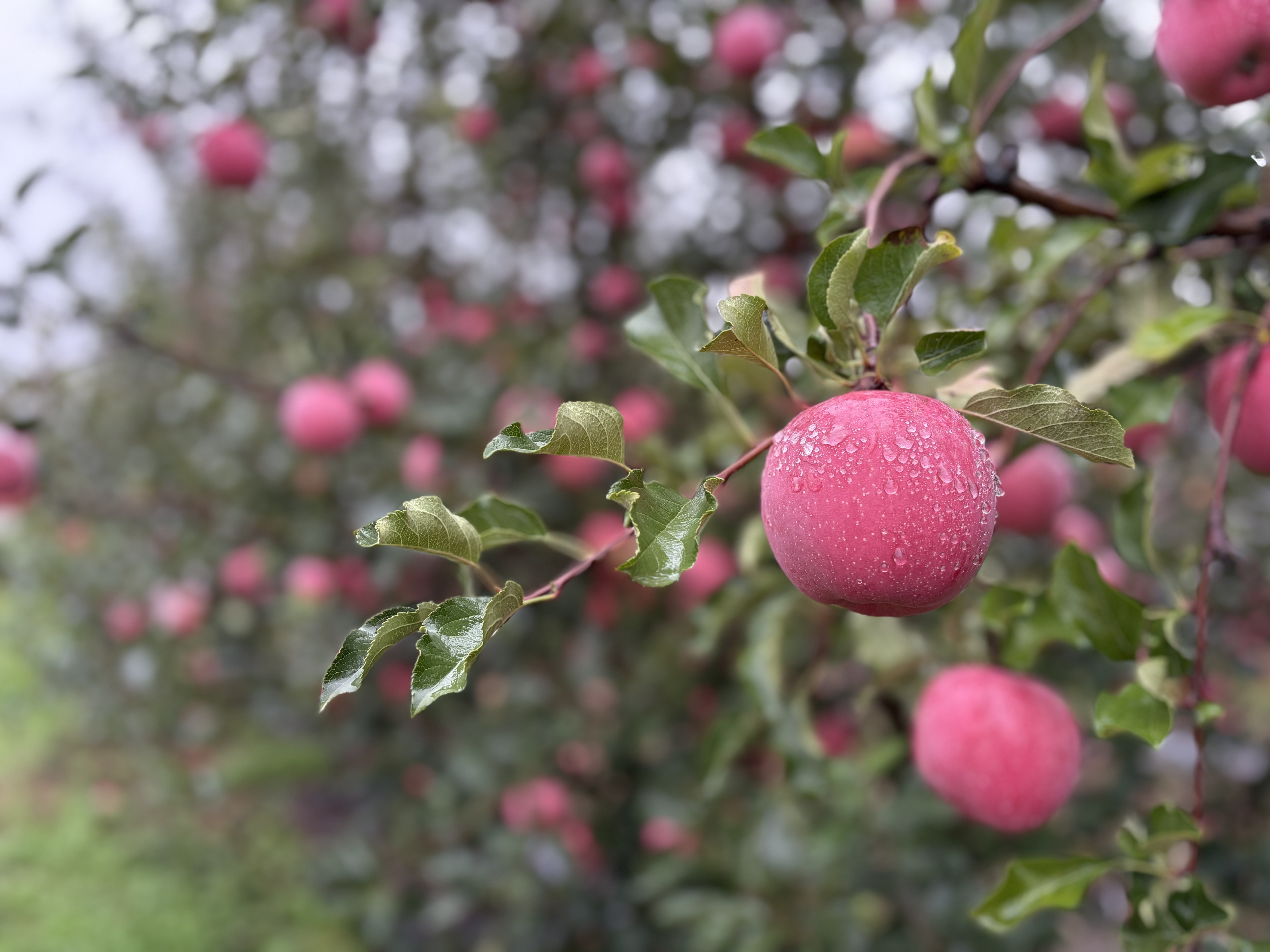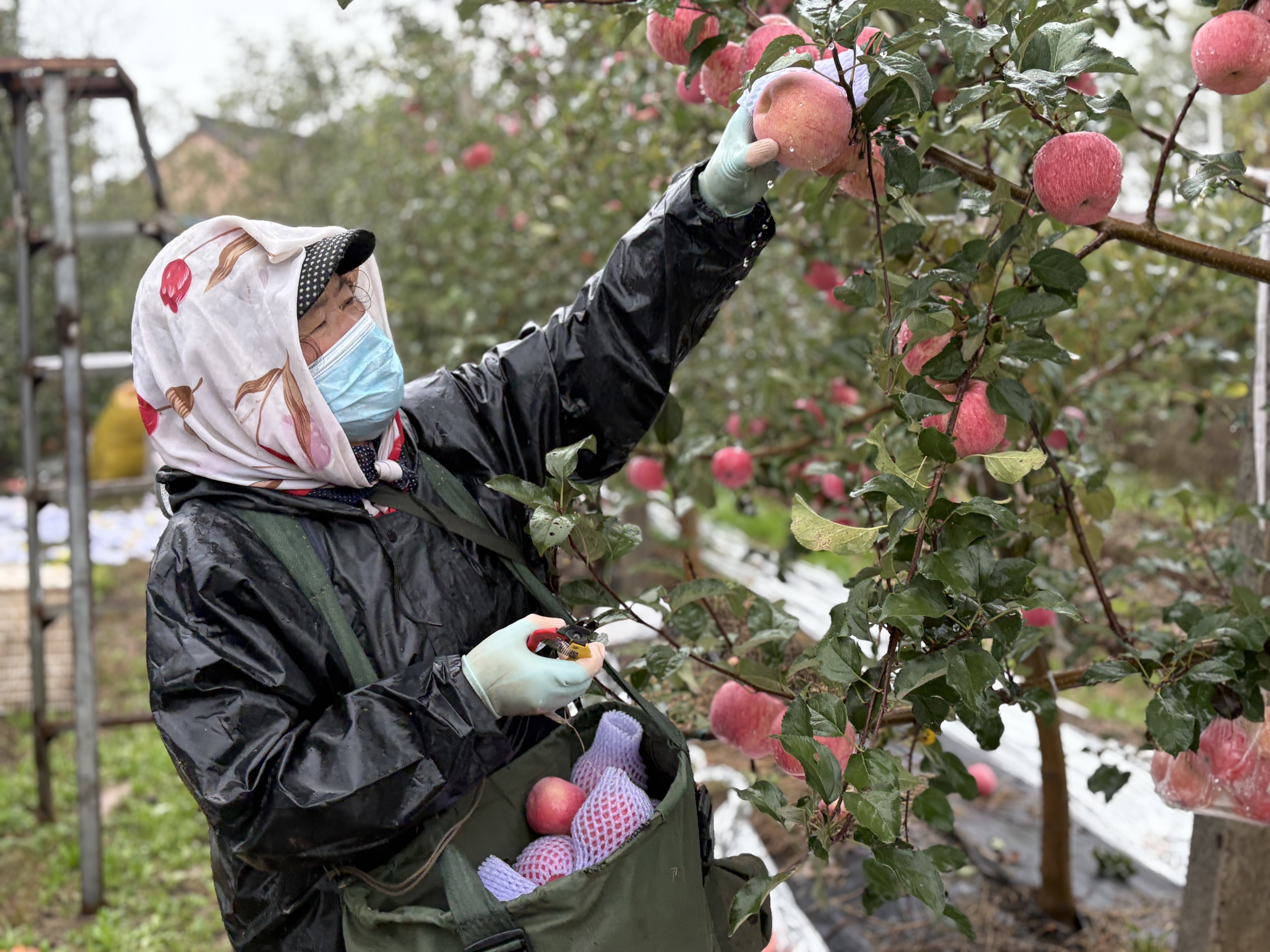 果园里细雨蒙蒙,红彤彤的瑞阳苹果压弯枝头,金黄的维纳斯黄金果泛着莹润光泽。果农们挎着果篮穿梭,指尖轻托果实、旋转摘袋,果篮碰撞的清脆声、果农间的谈笑声,与远处叉车运输的低鸣声交织在一起,在雨雾中奏响了热闹的丰收乐章。不远处的气调库内,果香扑面而来,分拣线上工人们将苹果逐个经大小筛选、糖度检测后,迅速装入礼盒内,一派产销两旺的繁忙景象。