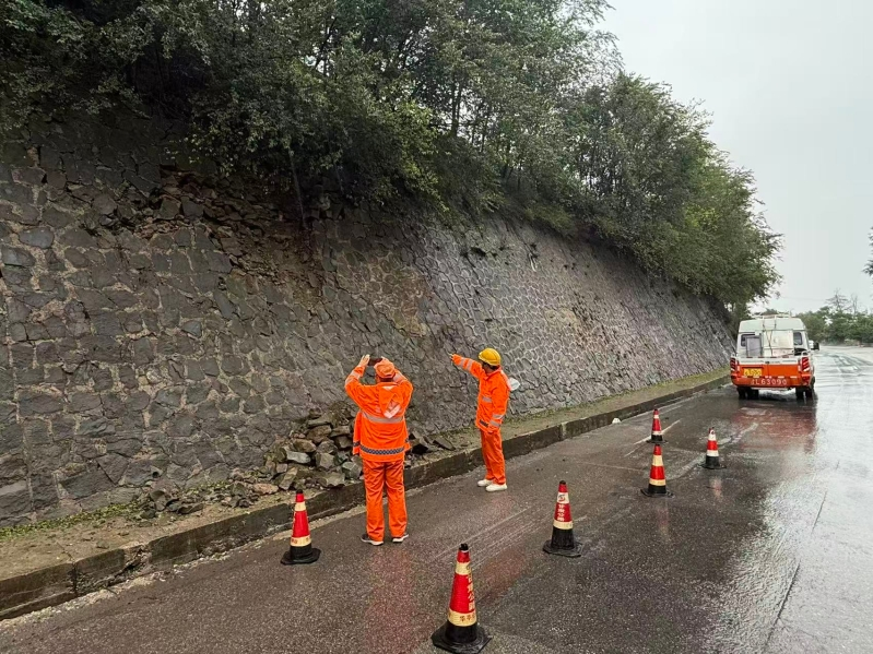 在S203线铜城峡路段,养护人员正有序开展防护设施检修与路面清理。现场安全标志规范齐全,人员机械配合默契,迅速将落石运离、还路面于整洁。与此同时,专人值守观测边坡状况,为作业安全加上“双保险”。