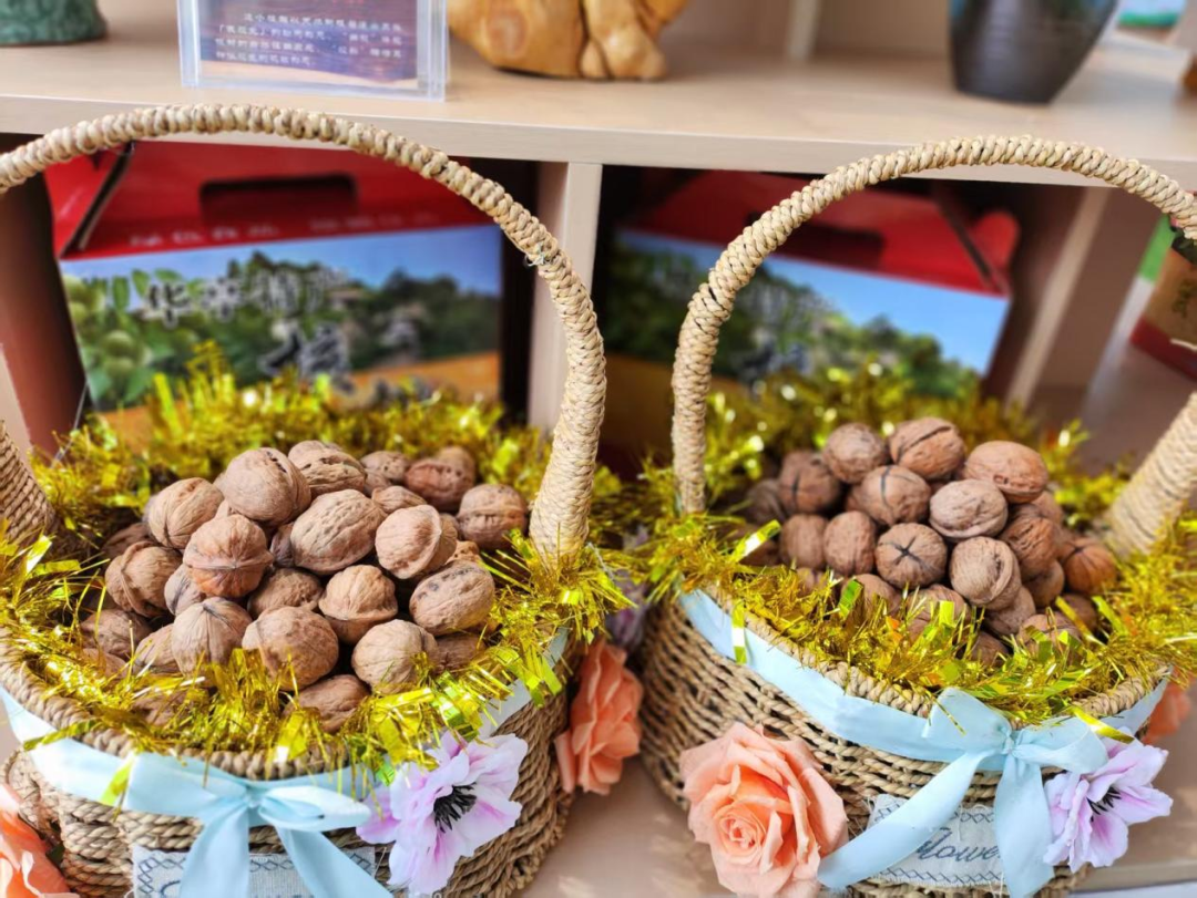 东华镇核桃展区满是浓郁的乡土气息,刚亮相便凭借饱满的果形与优质口感吸引众多观众。展台上,浅褐色的核桃整齐码放在精美的篮子里,外壳纹路清晰,工作人员随手拿起一颗轻捏便开,露出洁白饱满的核桃仁。试吃区里,原味核桃仁脆香十足、甜而不腻,不少观众尝过后称赞“果肉细腻,没有涩味”。