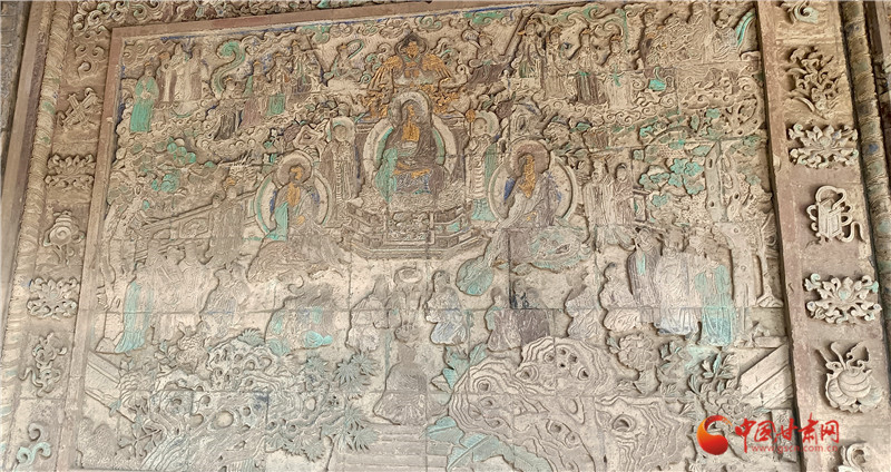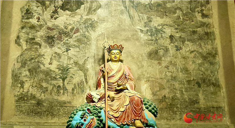 这幅壁画绘于大佛殿内大佛身后墙壁,色彩虽已斑驳,却仍难掩其艺术价值,是大佛殿内时代较早、艺术水准极高的作品。它距地面高1.55米,上下两端用墨线勾出边栏,边栏内绘缠枝牡丹点缀;《西游记》故事图居于正中,残长约4.4米,残高约2.9米,面积约12.7平方米,壁画前今塑有地藏王菩萨像一尊。壁画由“取水子母河”“道昧放心猿”“大战红孩儿”等多个独立故事组成,画面里险山怪石、古木溪水、云雾火海错落交织,而师徒四人的分工设定始终清晰:猪八戒挑行李、沙僧牵马、孙悟空持金箍棒护送,这份“固定分工”让猪八戒的勤劳形象贯穿全程。