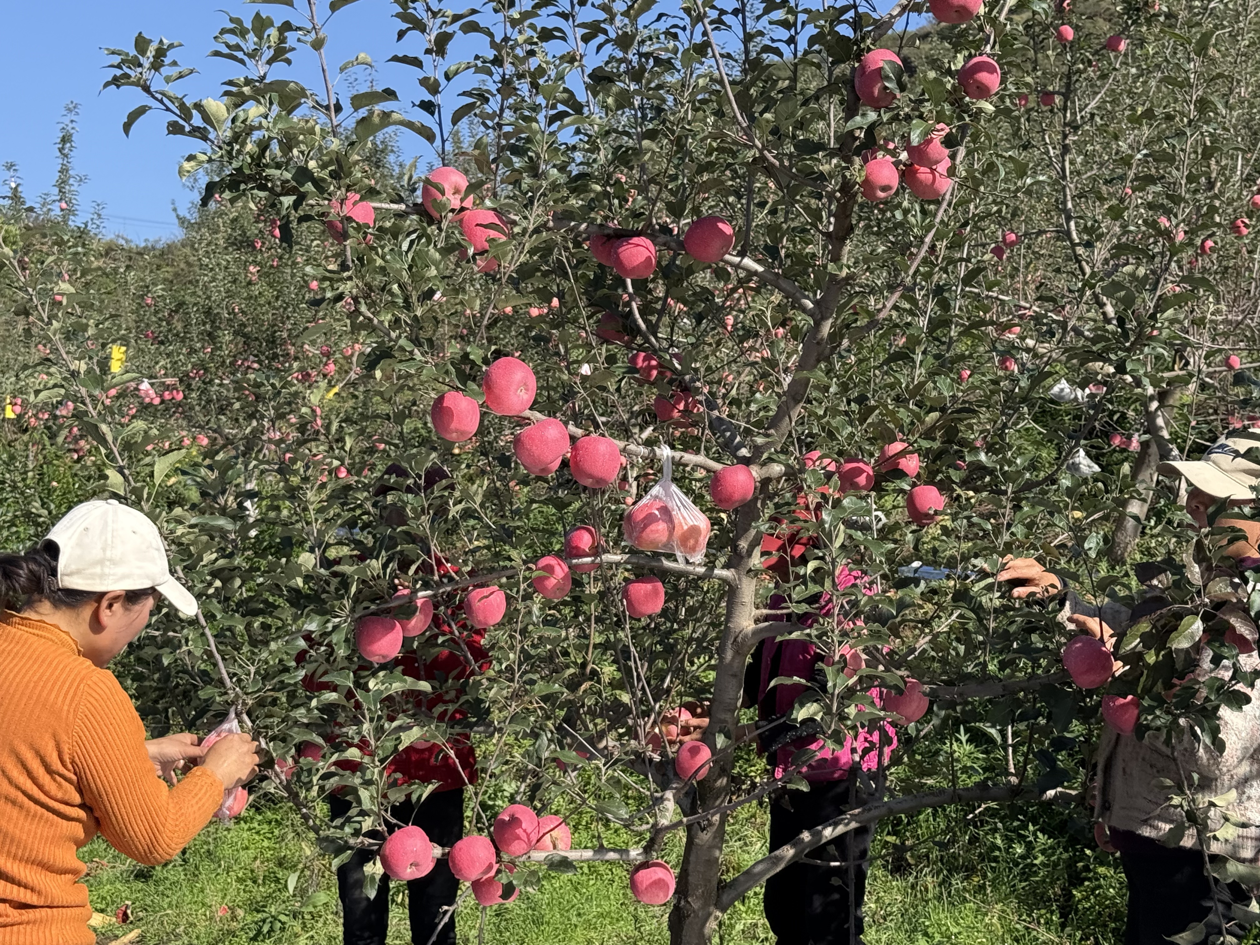 华亭市神峪乡下关北山苹果示范基地苹果园里,已是硕果满枝,一派丰饶景象。工人们穿梭在果树间,采撷着一颗颗圆润饱满的苹果,