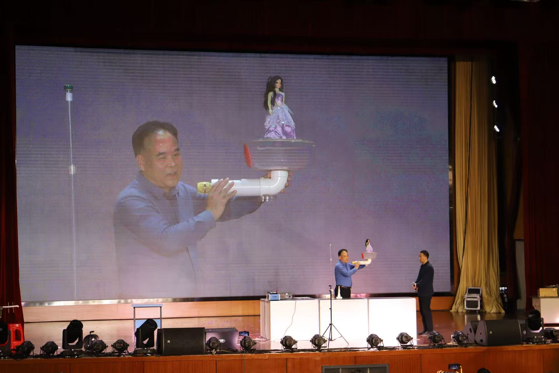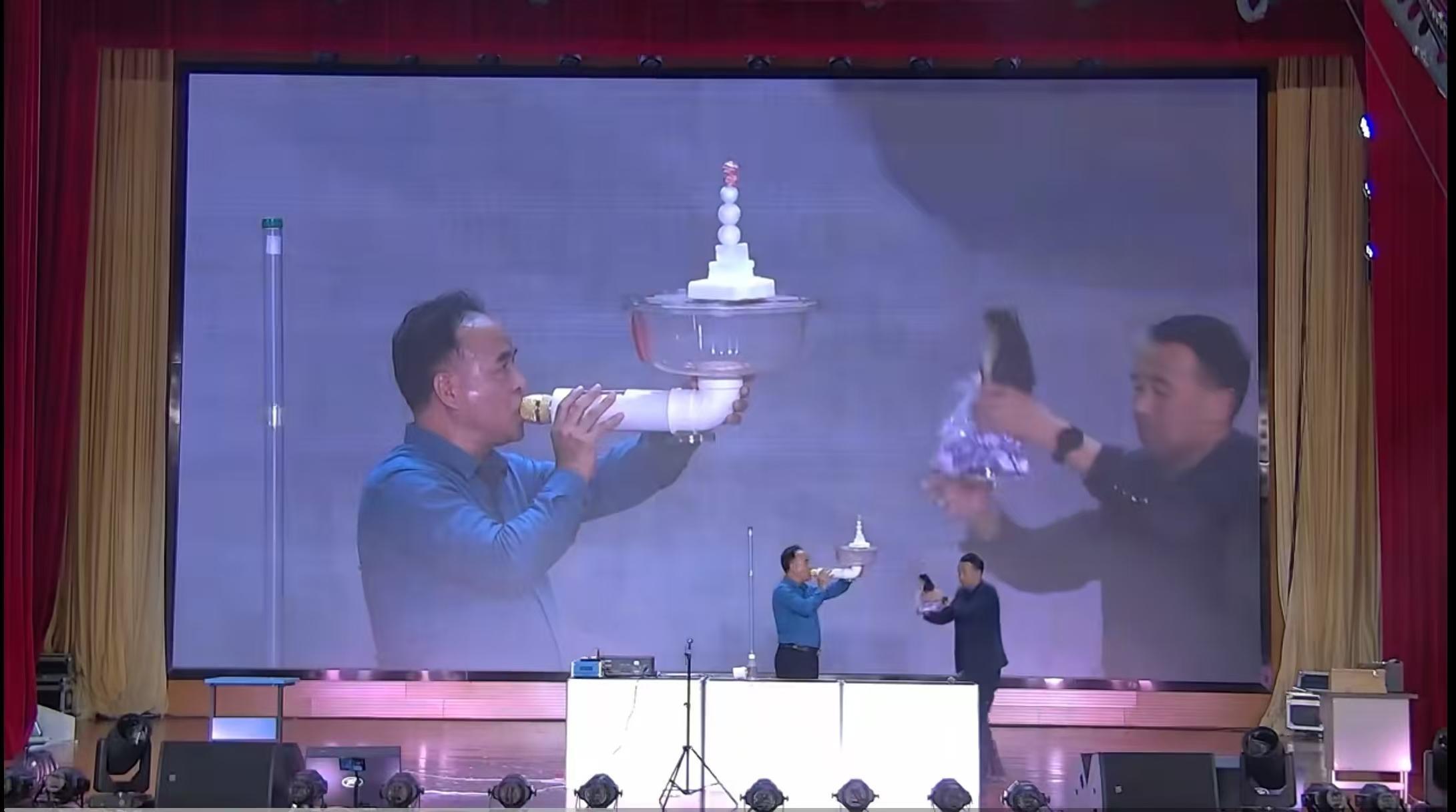 原灵台三中校长、陇原名师尹建勇与灵台二中教师李宏德,带来联合设计的《声波浮球》《旋转娃娃》实验。当两人抱着洗脸盆、玩具娃娃、饮料瓶等日常物品上台,观众满是好奇。李宏德先简释实验原理,以提问设置悬念;尹建勇随即用西北豪放嗓音唱响江西红歌《红星照我去战斗》,塑料盆口纸板上的玩具娃娃应声转动,现场掌声雷动,紧接着《声波浮球》实验更将气氛推向高潮,泡沫小球的奇妙动态获专家赞叹。