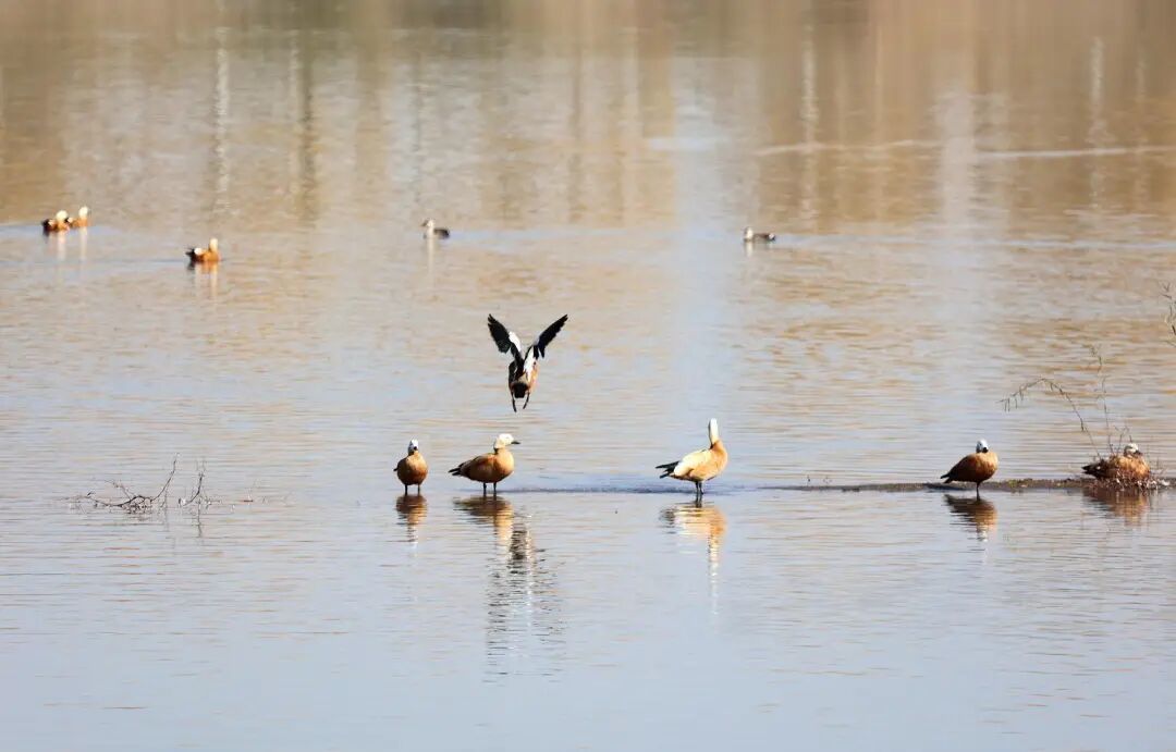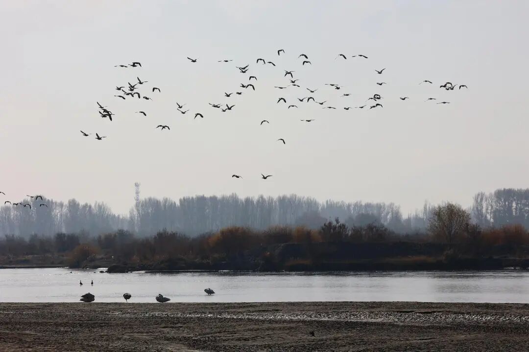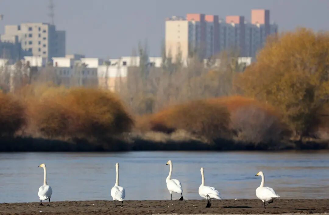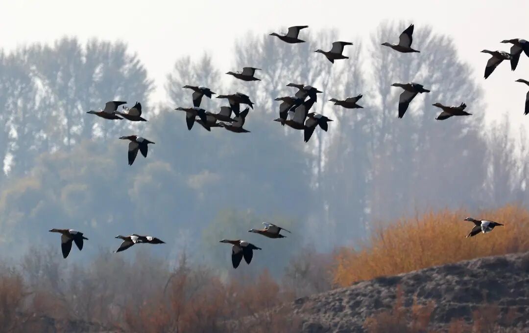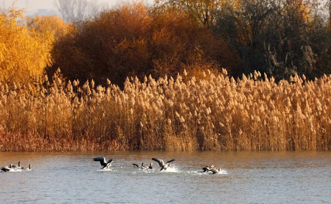 11月4日,在张掖市高台黑河湿地国家级自然保护区,灰雁、赤麻鸭、大天鹅等首批南迁候鸟觅食、栖息。它们在晨光中翩翩起舞、追逐嬉戏、啼鸣欢歌,构成一幅人与自然和谐共生的生动画面。
