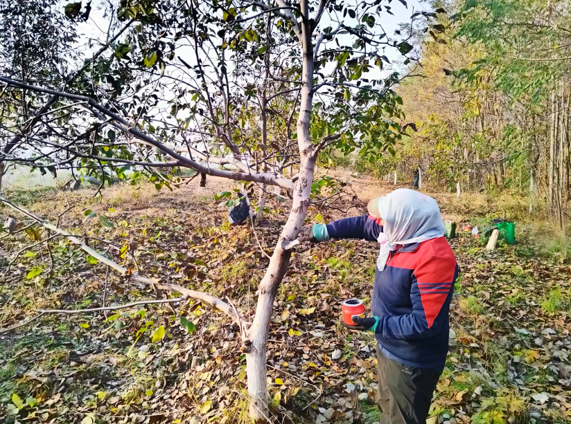 全面涂白,防虫抗冻筑屏障。树干涂白现场忙碌有序,果农们严格按照“上口平齐、下至根基”标准,为核桃树均匀涂刷涂白剂。该涂白剂由生石灰、硫磺等原料配制,兼具防冻、杀虫、防日灼功效。“涂白后,白色涂层能反射阳光,减少树干因昼夜温差大出现冻裂的情况,还能有效杀灭藏在树皮缝隙里的越冬虫卵,就像给树木量身定制了‘防护衣’,让它们越冬更安全可靠。”现场管护人员说。
