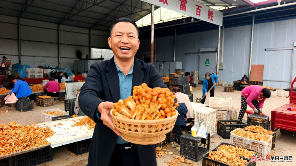 当下,正是菌菇鲜嫩上市的好时节。走进陇南徽县(蔬菜、食用菌)省级现代农业产业园,一筐筐金黄饱满的滑子菇整齐码放,工人们指尖翻飞,将刚采摘的菌菇快速裁剪、分级、装筐,称重后的鲜菇随即被送上货运车辆,一路奔赴销往全国乃至海外市场。在榆树乡鑫亮菌业种植基地,层架上的滑子菇如金色星花般簇簇绽放,采菇工人穿梭其间,采摘、搬运、分拣的身影与金黄滑子菇此起彼伏的层架相互交织,勾勒出一幅丰收在望的喜人画卷。