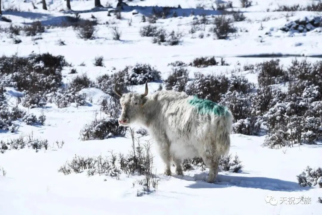 那散落其间的白牦牛,它们如洁白的珍珠,长毛拂雪,在寂静中缓缓踱步。风吹过原野,偶尔卷起冰面上的浮雪,如同为这片凝固的湖水系上一条飘动的哈达。站在这里,世界仿佛只剩下蓝与白两种颜色。白牦牛是这画卷中温顺的精灵,冰湖是沉睡的明镜,而你是这静谧中唯一醒着的灵魂。这片被冰雪净化的天地,终将化作你心中长久的宁静。